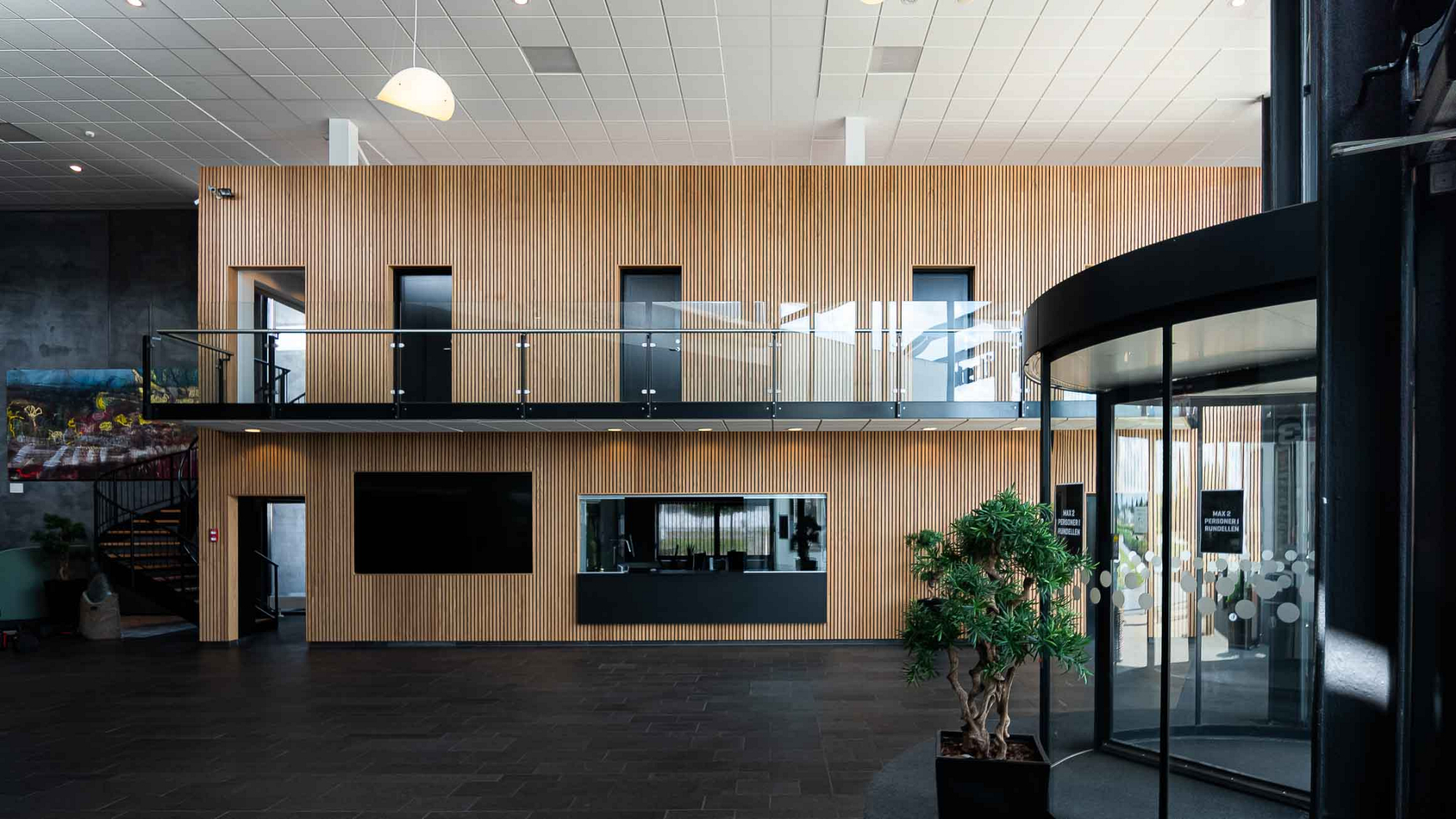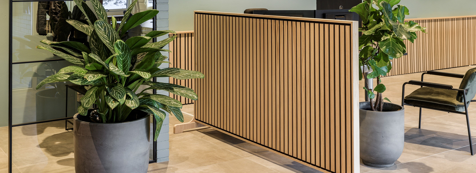 UniPanel® – plant og unikt træpanel med fer og not samling – og DivideWall, en lamelvæg der både skaber rum og elegance.