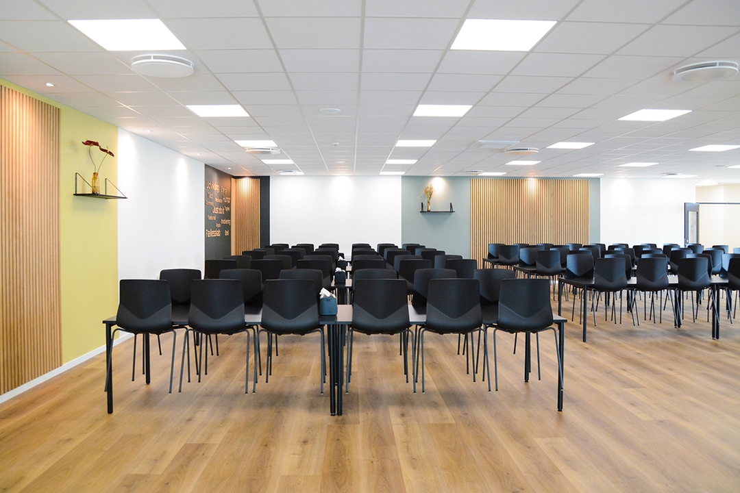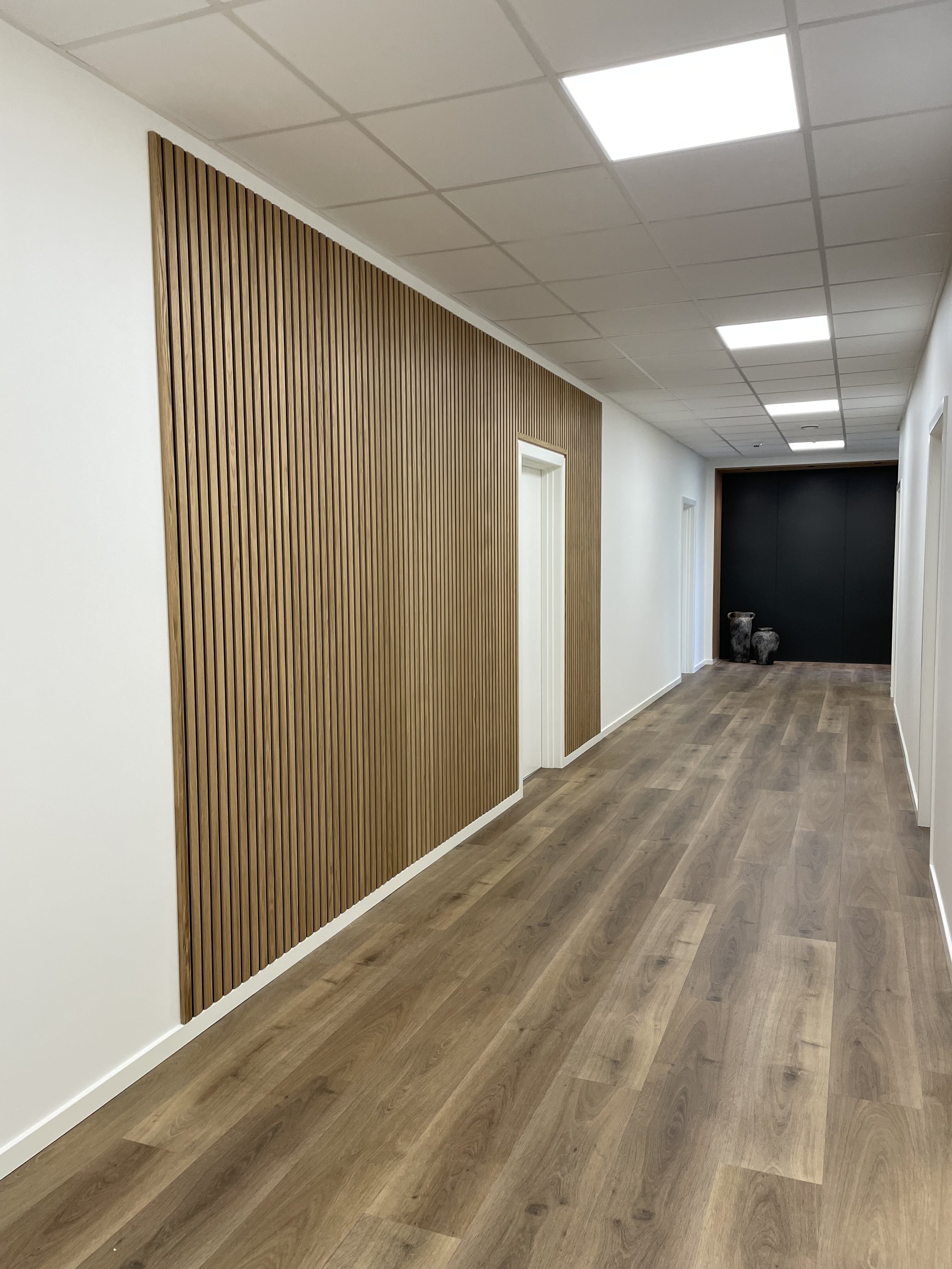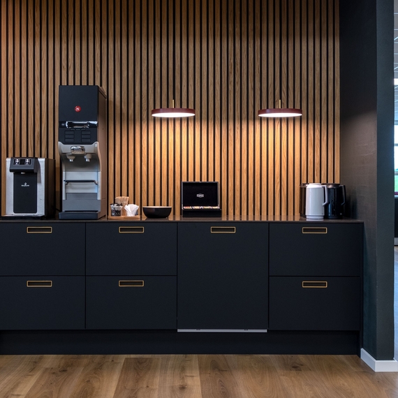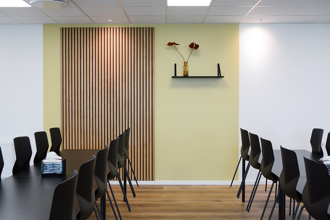 Hos billigarbejdstøj.dk har vi været med til at give kantinen et løft, der gavner både æstetik og akustik. Der er nemlig tilføjet nye farver, og naturen er blevet inviteret ind med træpaneler fra I-Wood Denmark®. Dermed nedsættes støjen, som medarbejderne hos billigarbejdstøj.dk bliver udsat for i en fyldt kantine i den travle hverdag.