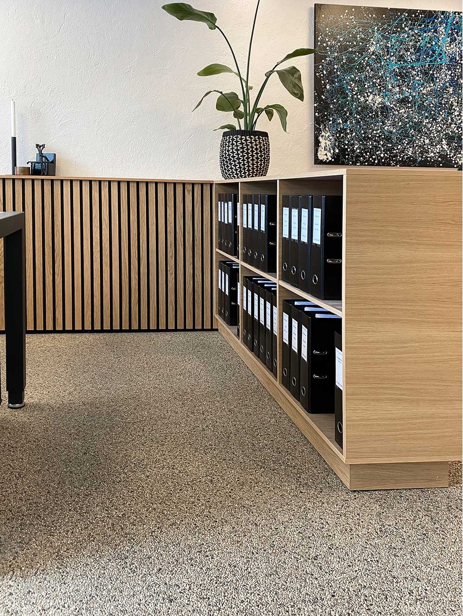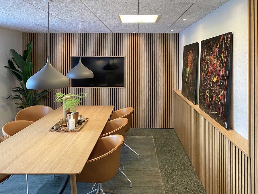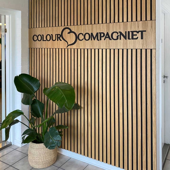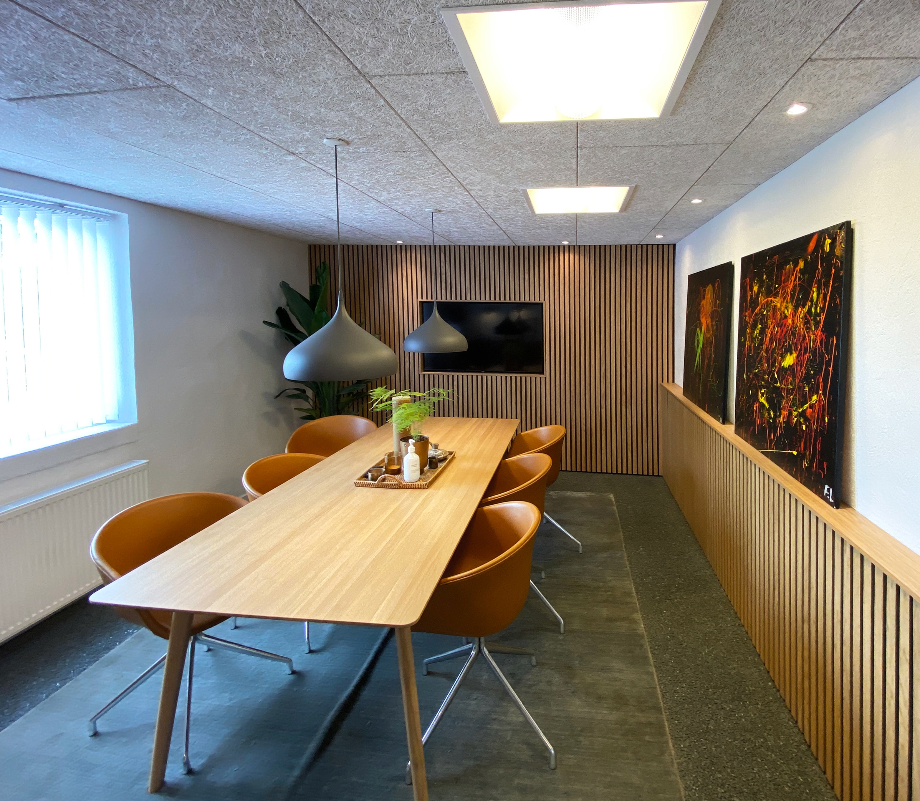 Kontor og mødelokale hos Colour Compagniet nær Herning har fået en opgradering med akustikpaneler fra I-Wood Denmark®. Panelerne fjerner unødig støj og rumklang for at skabe et bedre arbejdsmiljø. Derudover er det en æstetisk opgradering til en virksomhed, der netop selv arbejder med flotte overflader.