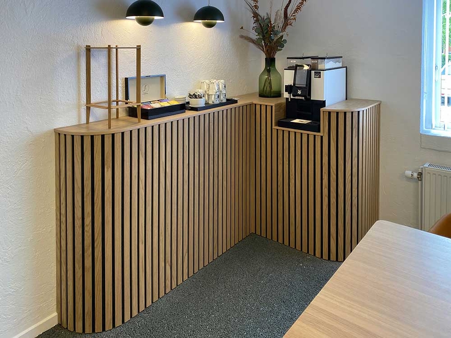 Projektet hos Colour Compagniet består både af traditionelle vægpaneler, men også specialdesignede løsninger med integreret kaffebar og reoler.