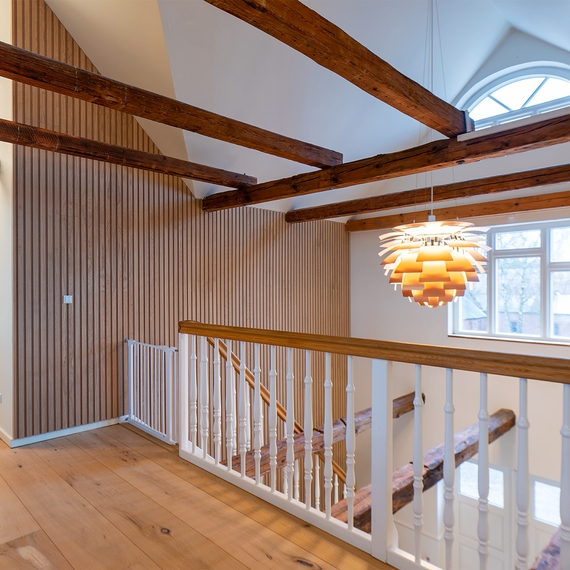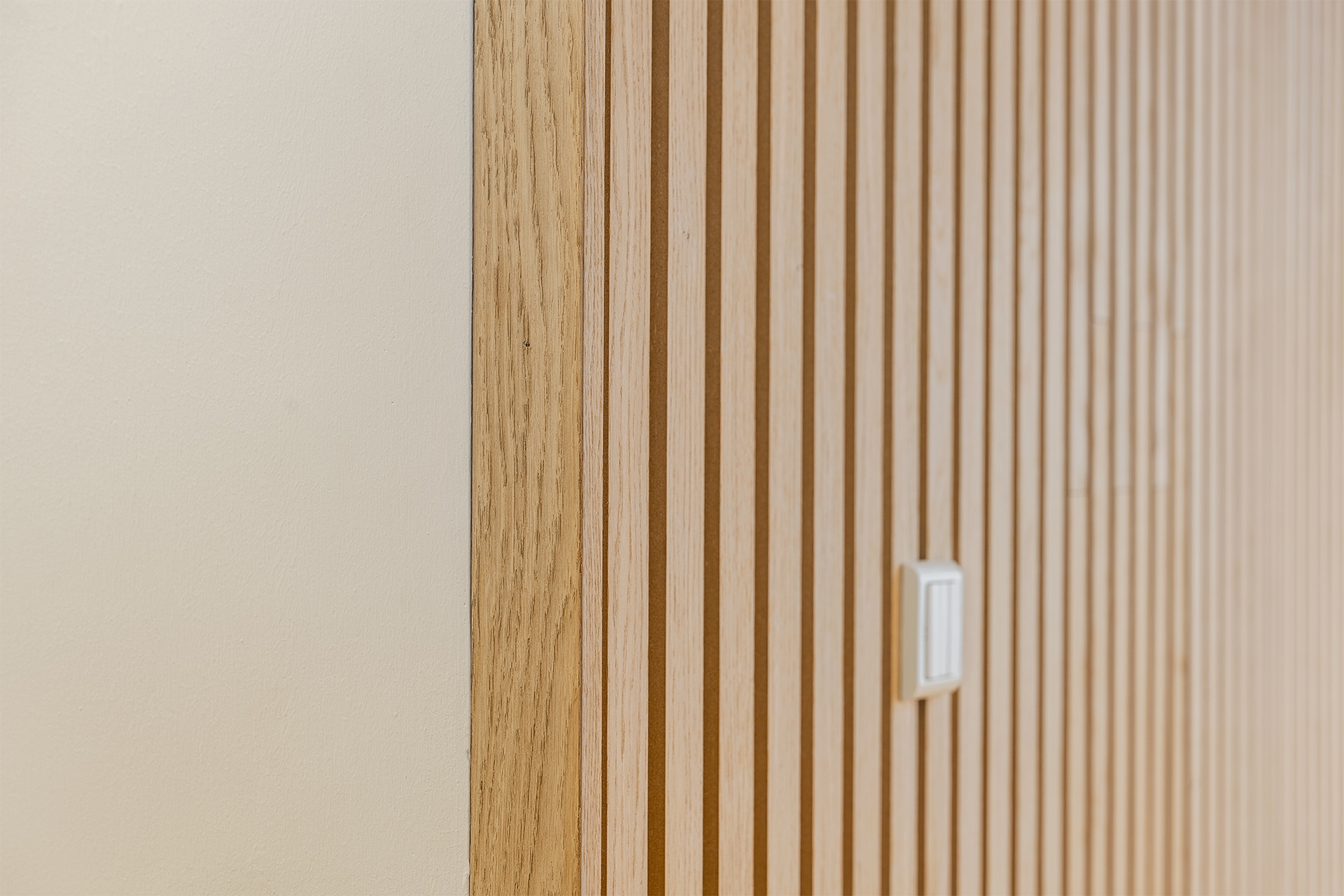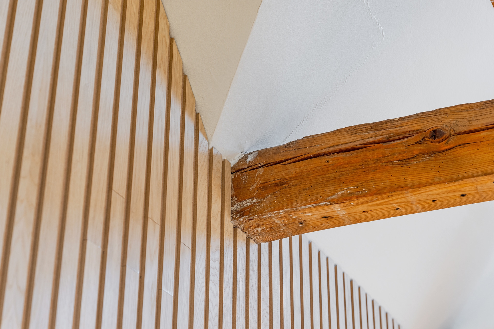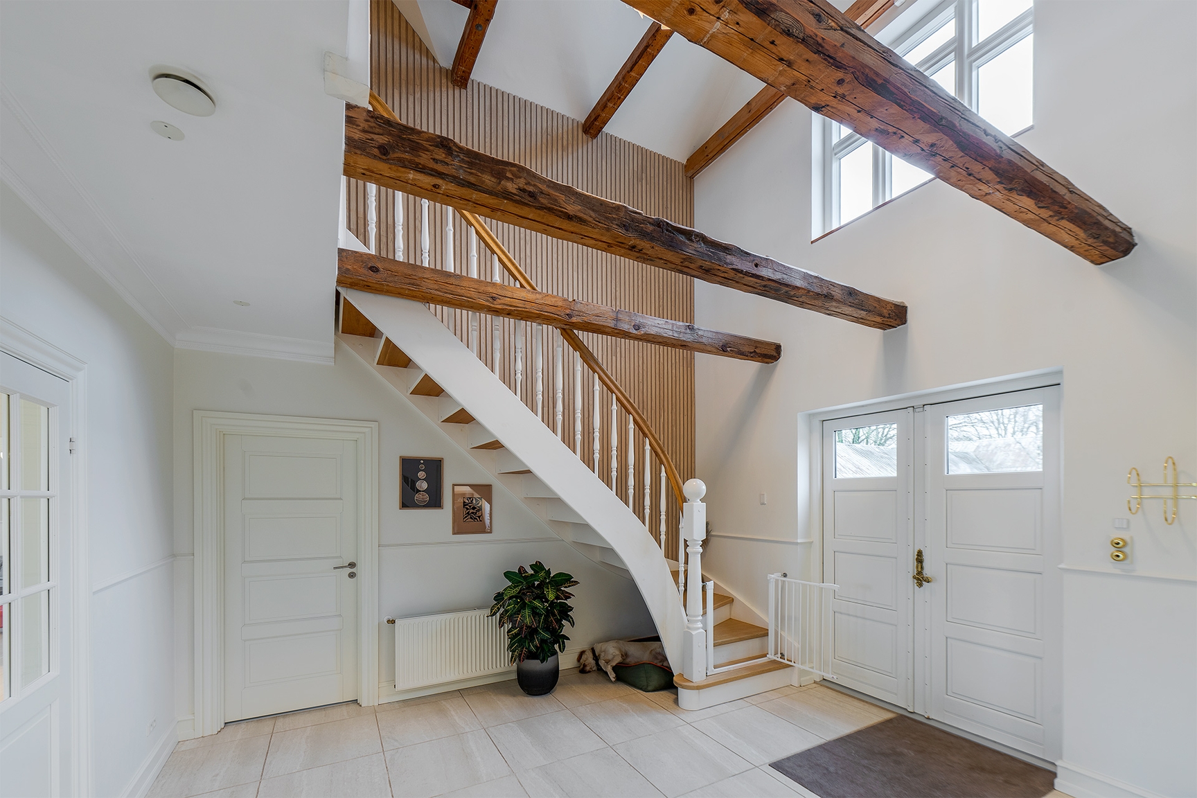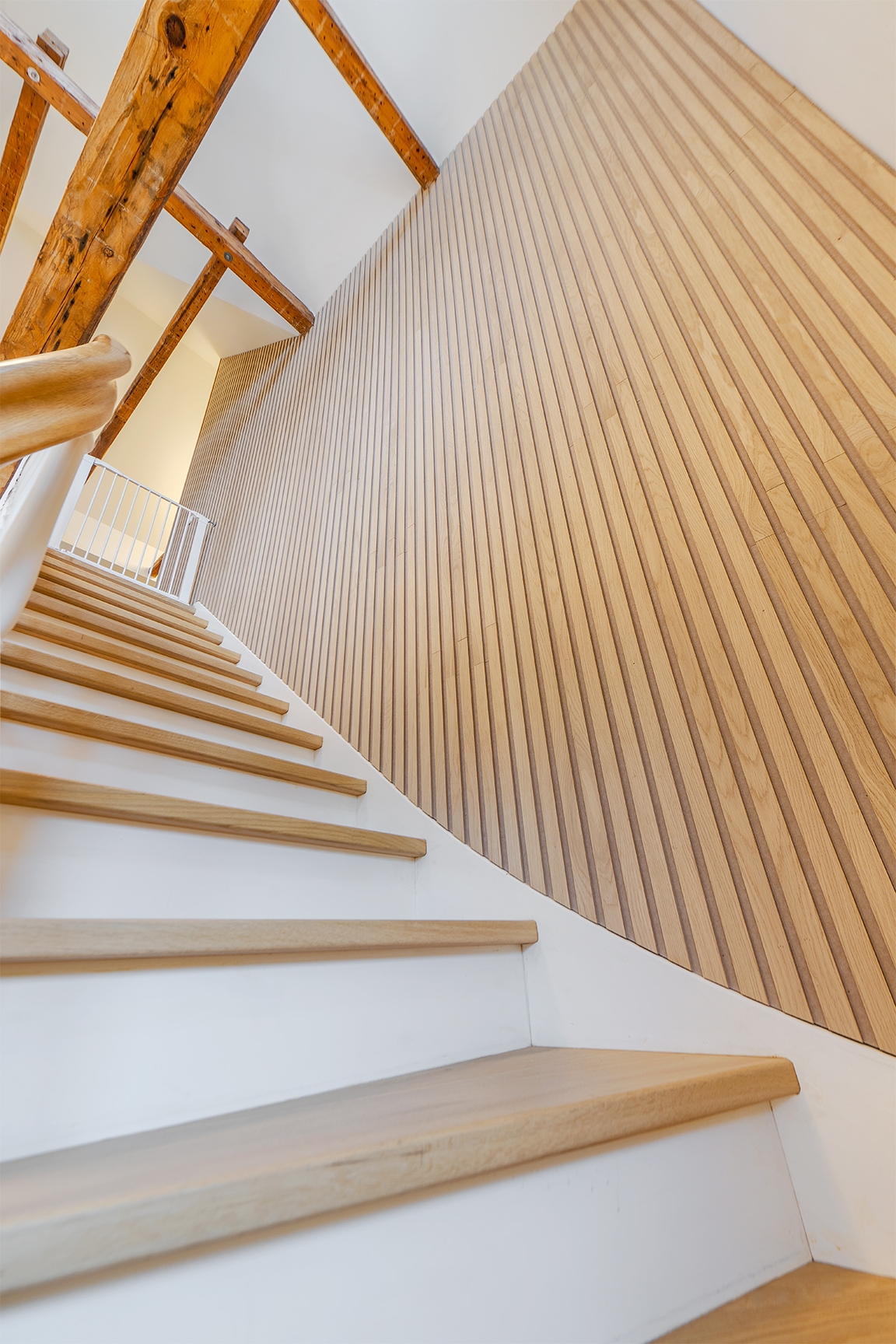 Vægpaneler med beige filt er monteret ved trappen til 1. sal. Her skaber de en indbydende atmosfære lige fra første skridt indenfor. Det unikke ved dette projekt er samspillet mellem de moderne paneler og de originale træbjælker. Denne kontrast fremhæver de smukke detaljer ved afslutningerne og skaber en visuel forbindelse mellem hjemmets historiske elementer og moderne design.