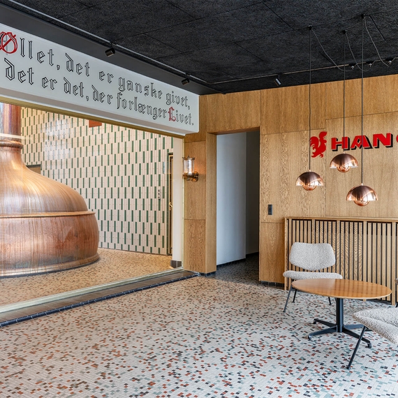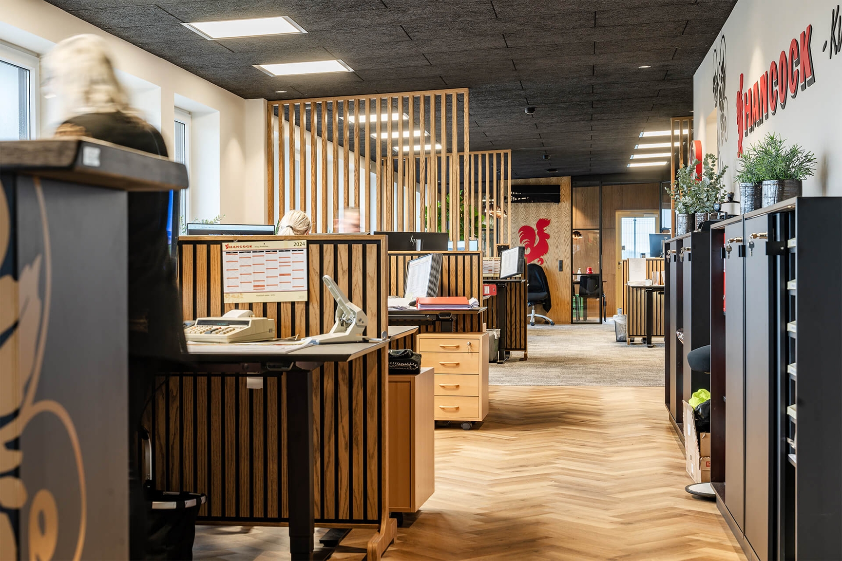 I-Wood Denmark® har med sine stilsikre akustikpaneler skabt en moderne og indbydende atmosfære i Hancock-bryggeriernes kontorer. De markante træoverflader tilføjer et eksklusivt præg, der smukt komplementerer kobber-bryggekarrene og giver en nutidig fortolkning af 50’ernes indretning. Samtidig forbedrer akustikpanelerne i både Flexi Frame og Flexi Wall kontorakustikken samt optimal rumopdeling.