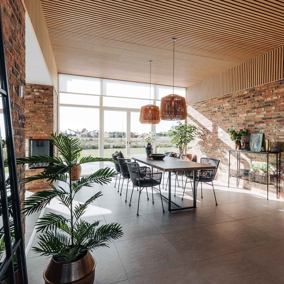 K2 Huset i Ikast står for at bygge unikke huse, og derfor valgte de at pryde deres udstillingshus med loftpaneler fra I-Wood Denmark®. Med de akustiske træpaneler til loftet er både æstetikken og akustikken helt i top, hvilket giver et forrygende helhedsindtryk med resten af huset.
