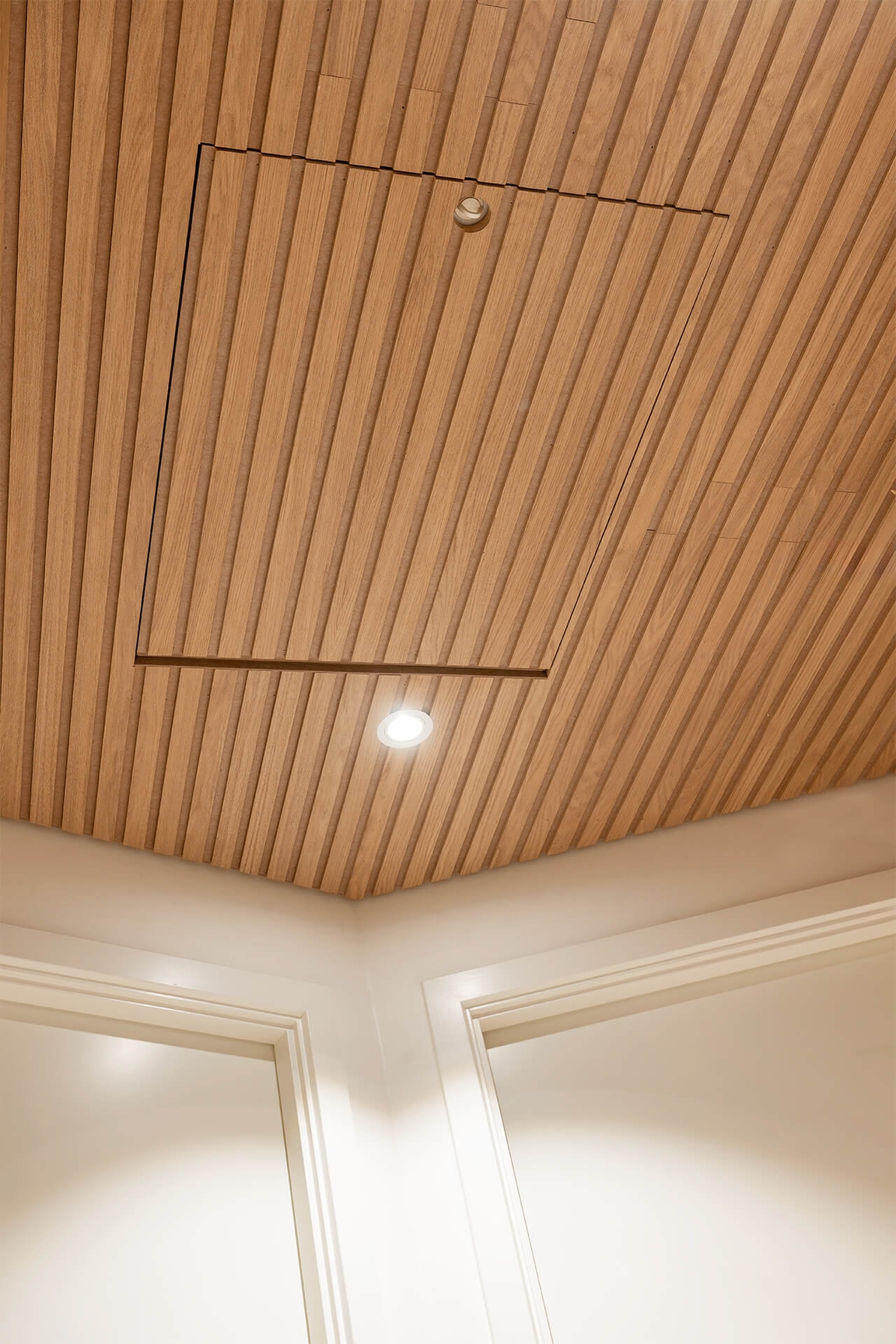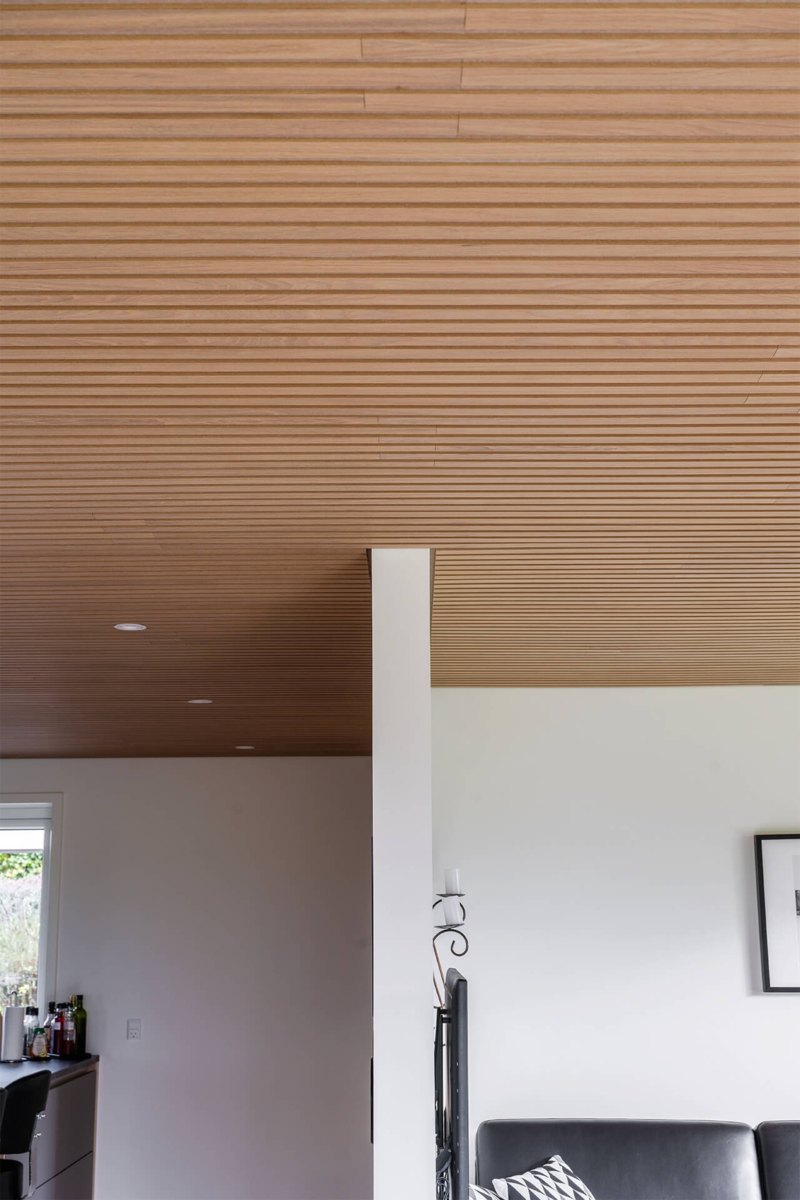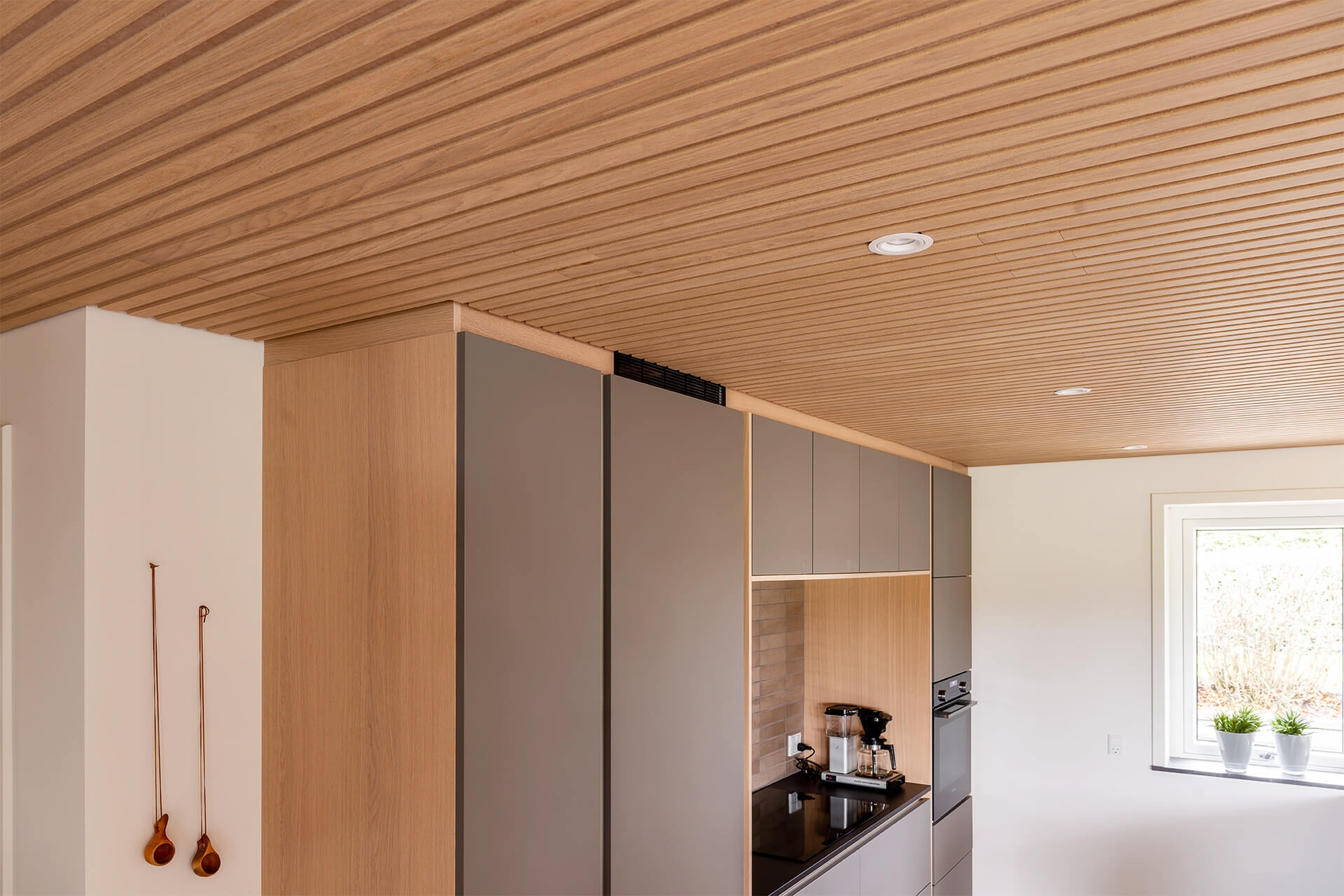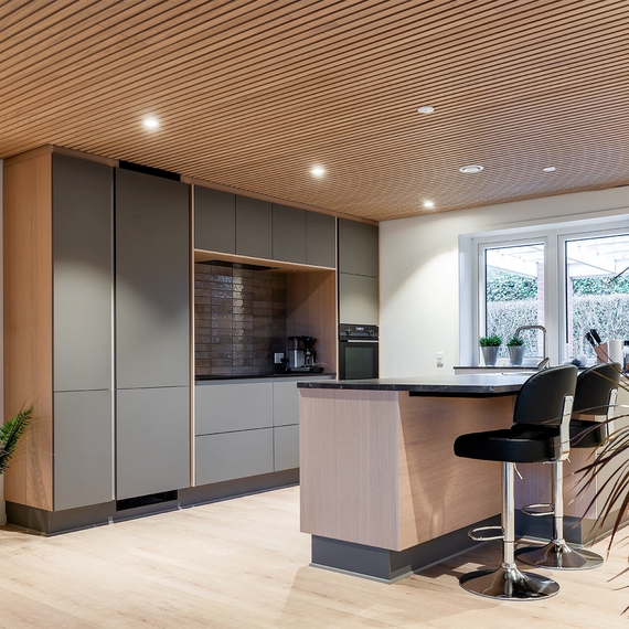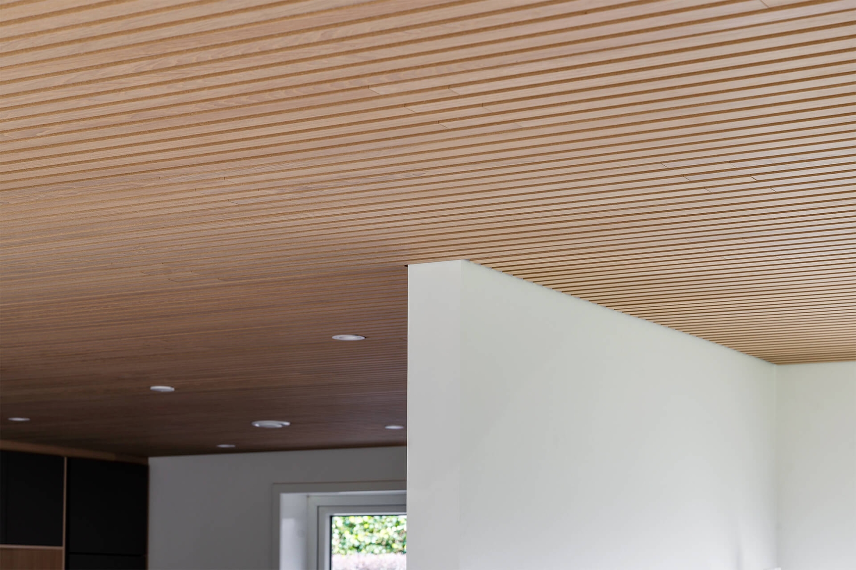 I-Wood Denmark® har løftet æstetikken og funktionaliteten i et klassisk 70'er hus. Ved renovering blev loftet skiftet til loftspaneler med beige filt. Ved at omfavne tone-i-tone trenden er der skabt en naturlig og elegant forbindelse mellem loftet og resten af rummet, hvilket giver en følelse af sammenhæng og harmoni. Designet til både øje og øre. De bløde og varme toner fra den lyse filt tilføjer et moderne touch, samtidig med at akustikpanelerne fjerne unødig rumklang.