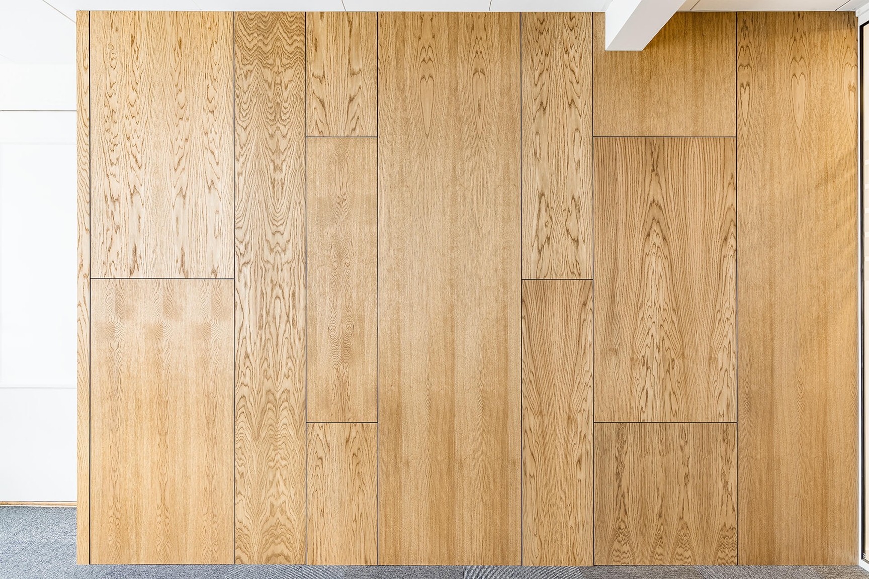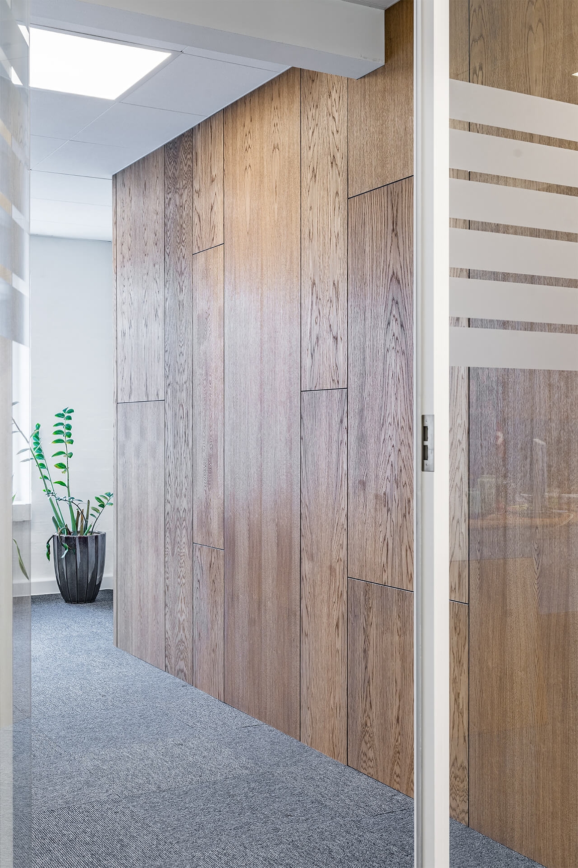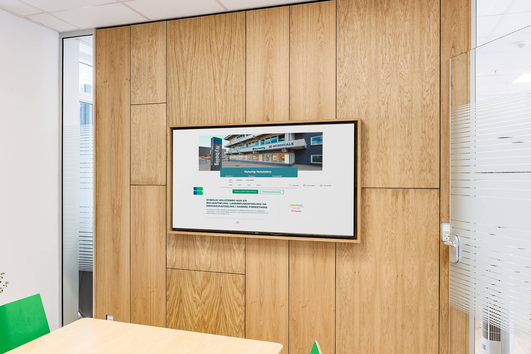 Hos ejendomsmæglerne i Nybolig er kontor og mødelokaler blevet opgraderet med I-Wood UniPanels på væggene. De elegante paneler er monteret med afslutningslister og lister til udvendige hjørner, hvilket giver et gennemført og præcist resultat, hvor hver detalje er gennemtænkt. Træets naturlige varme tilføjer en indbydende atmosfære, som både medarbejdere og kunder får glæde af. Ved at fokusere på håndværk og kvalitetsmaterialer har I-Wood Denmark® skabt en harmonisk sammenhæng mellem rummene.