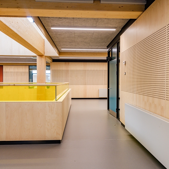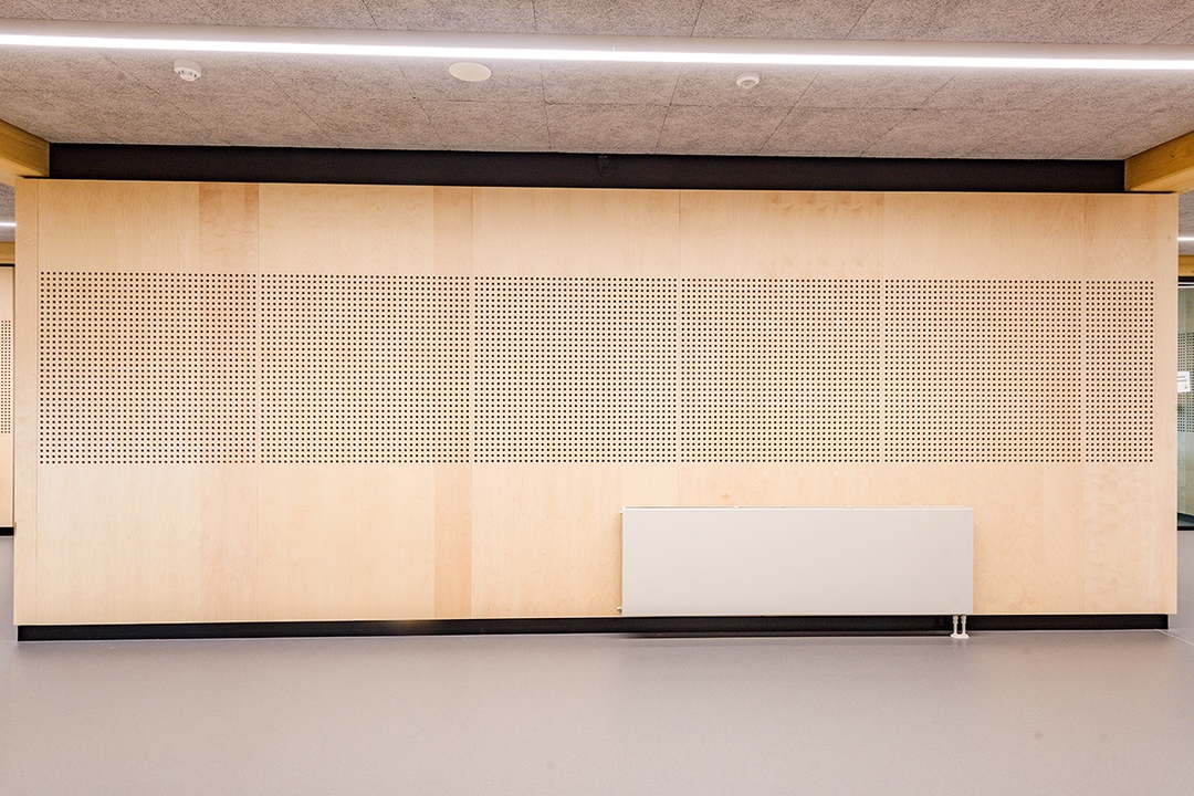 Den nye social- og sundhedsskole i Holstebro stod klar i sommeren 2021, og den 3.000 m2 store bygning er blevet beklædt med forskellige typer vægpaneler i træ fra I-Wood Denmark®. Akustikpanelerne fra I-Wood Denmark® er en kombination af plan- og perforerede plader og er lavet af brandimprægneret birkekrydsfiner og overfladebehandlet med en klar PU brandlak.
