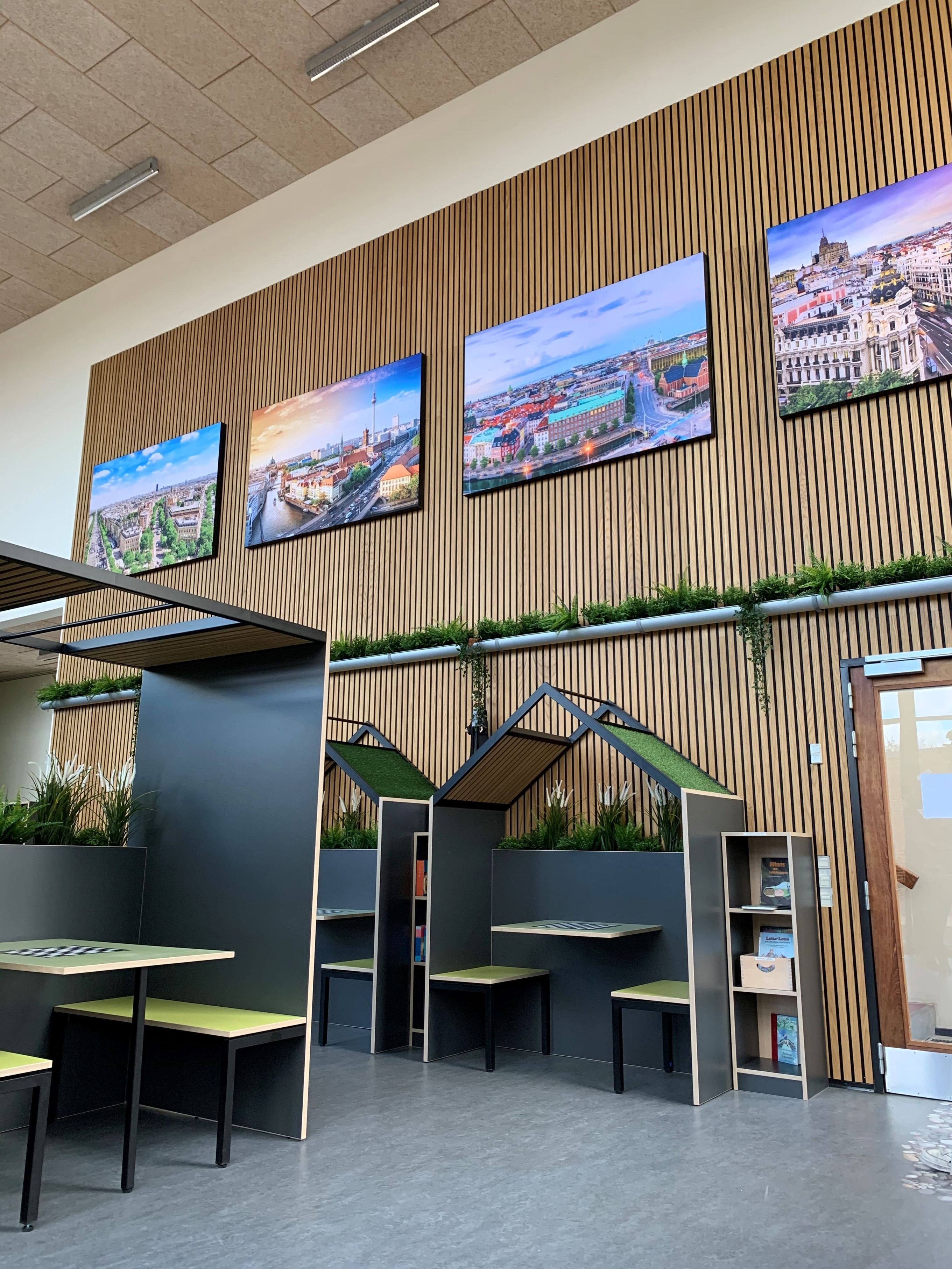 Utterslev Skole i København samler mange mennesker i store rum, og det kan give en dårlig akustik for både børn og voksne. Med vægpaneler fra I-Wood Denmark® har de sikret sig bedre akustisk, ligesom æstetikken også har fået et godt løft, så børnene lærer i flotte og gode rammer. Med inspiration fra byen er der skabt forskellige miljøer indenfor med blandt andet små huse. Dette projekt er lavet i samarbejde Ultima K.