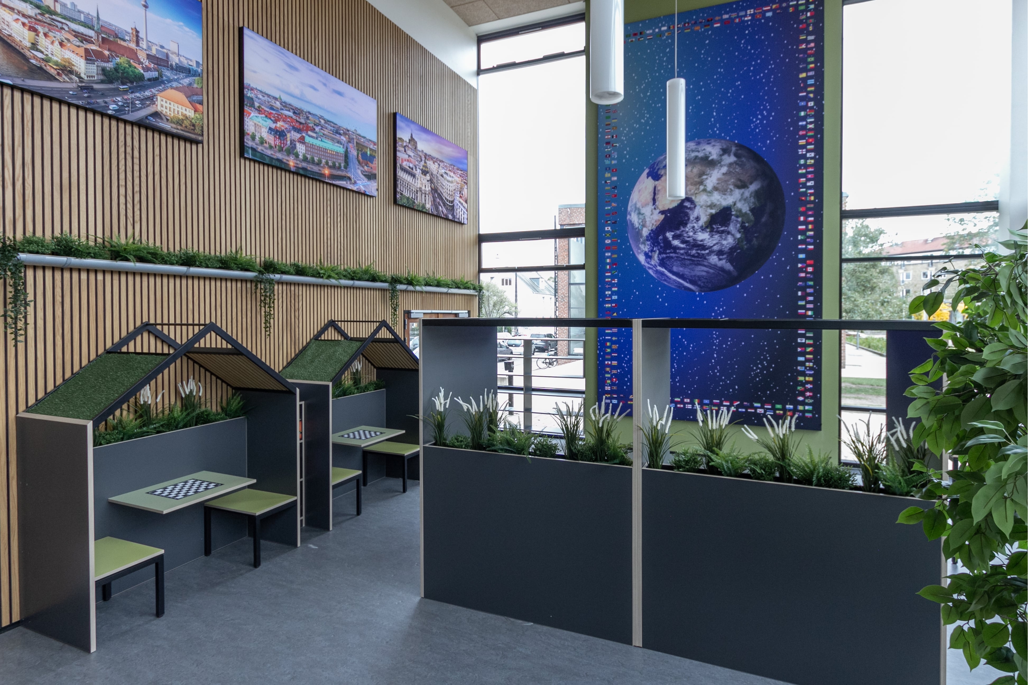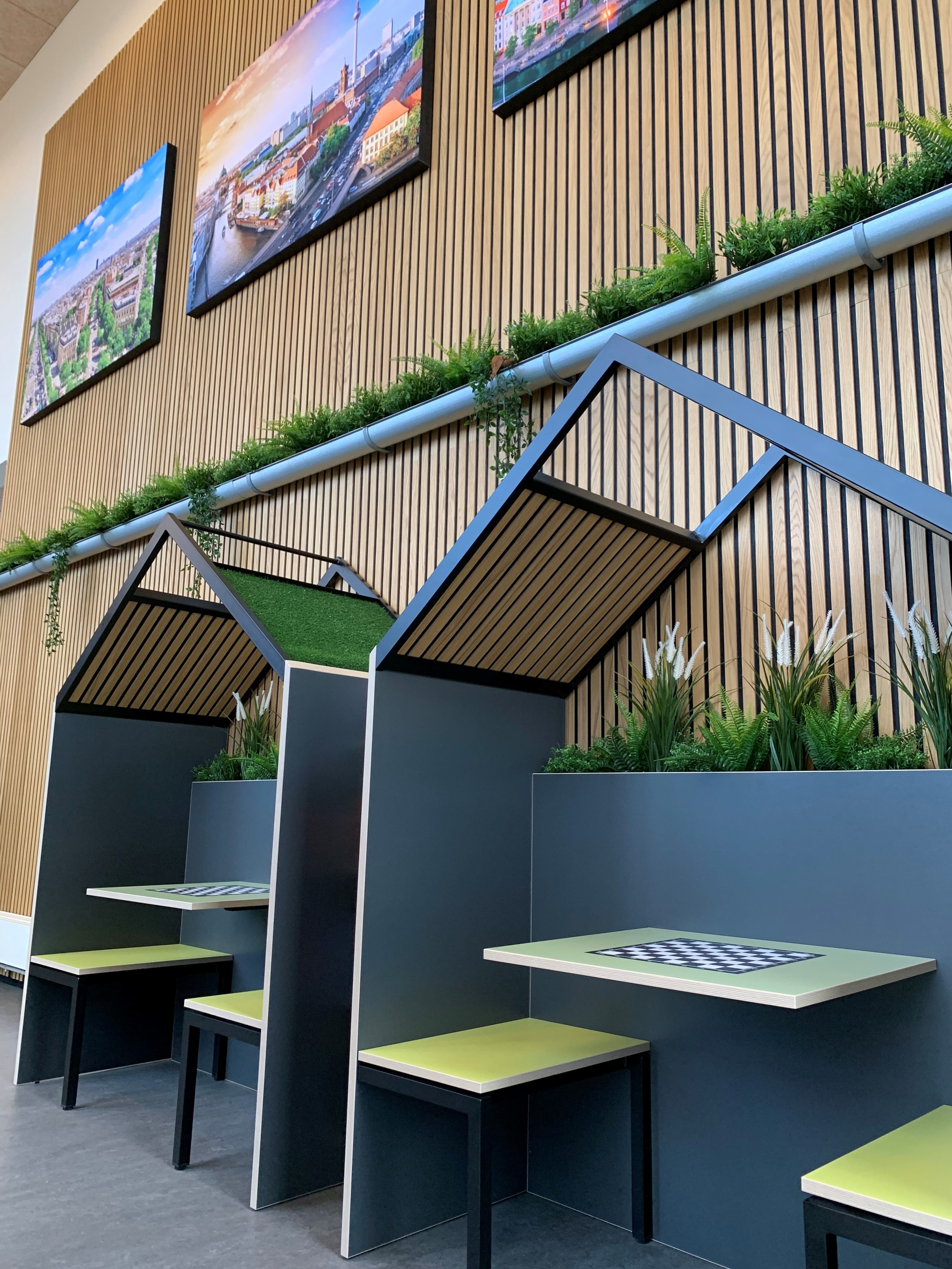 Samtidig udnyttede Ultima K muligheden for at arbejde kreativt med panelerne og skabte blandt andet et skyline-inspireret relief på en af væggene.