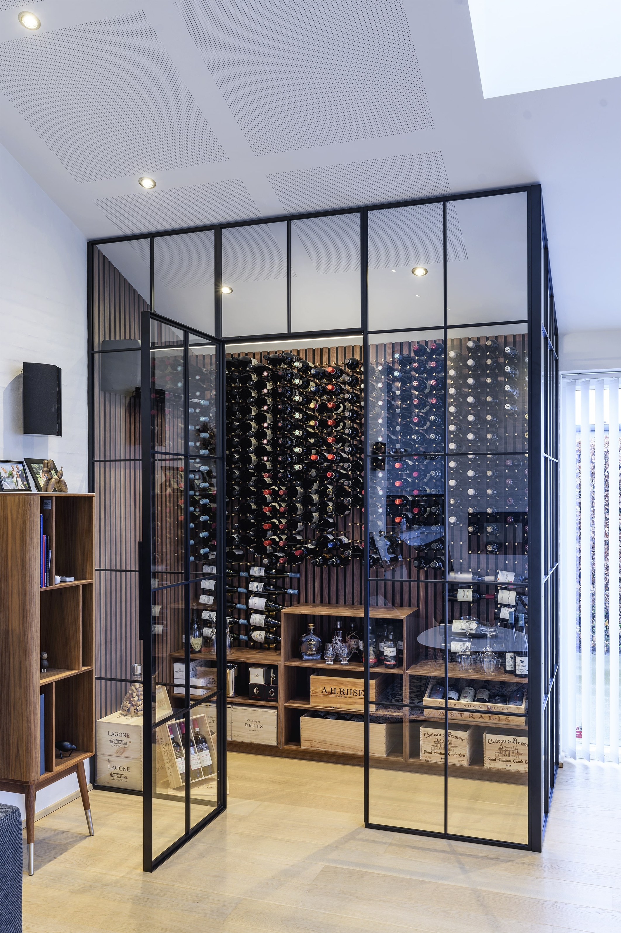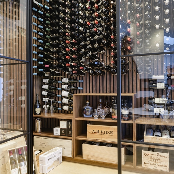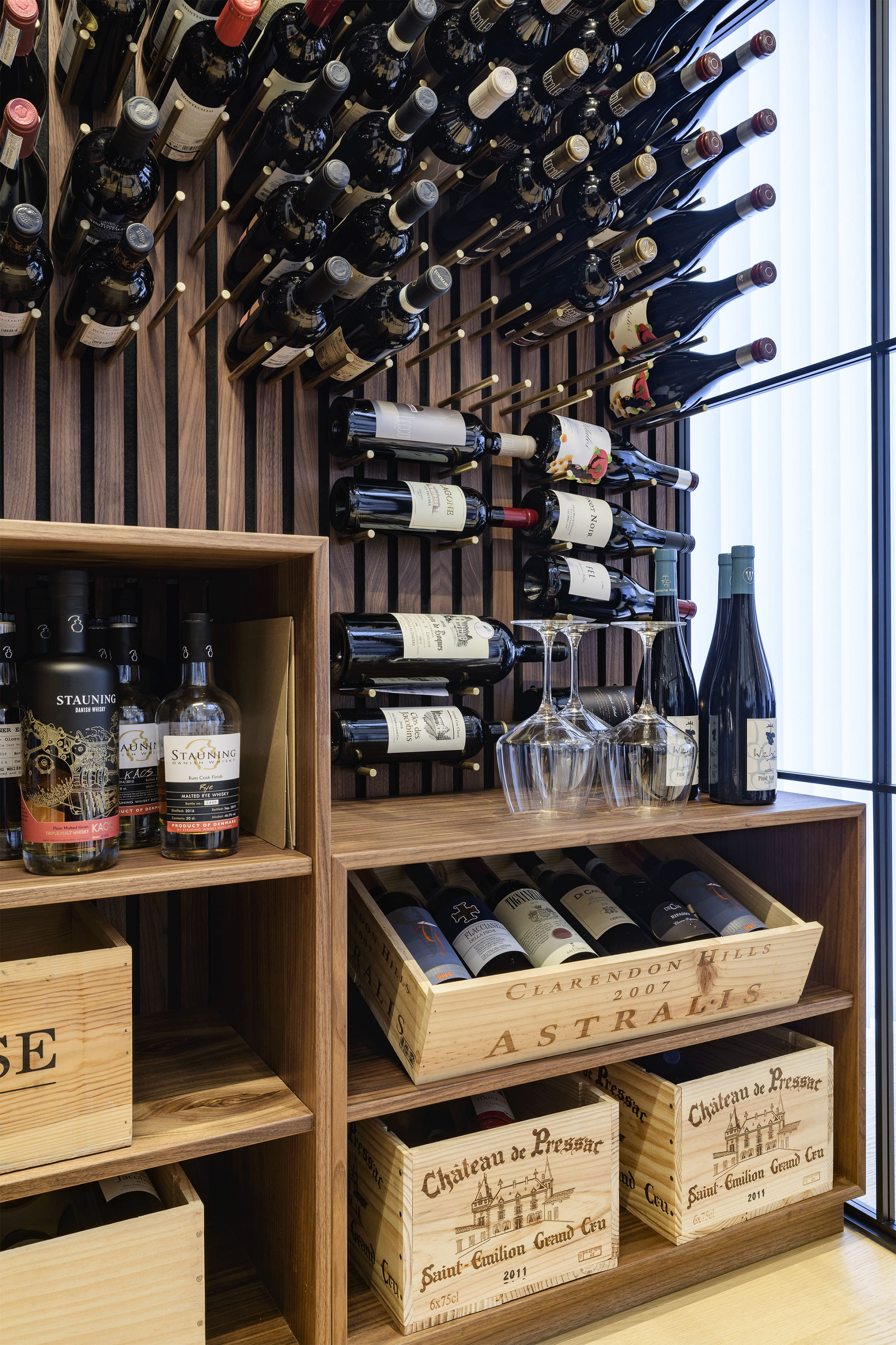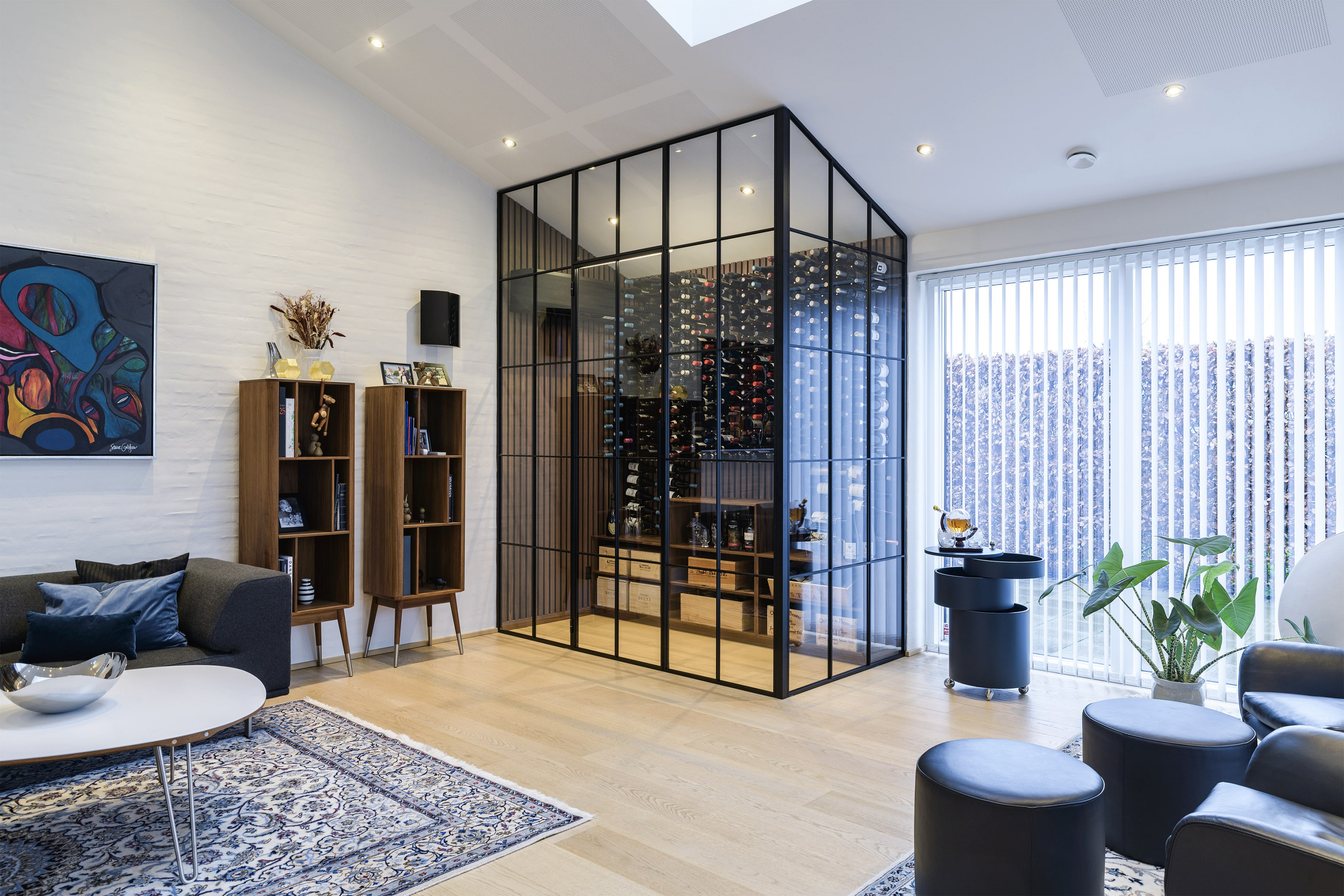 Da dette flotte vinrum skulle designes, blev træpaneler fra I-Wood Denmark® en del af rummet. Løsningen er med til at frame vinflaskerne i stilfuldt og moderne design. Derudover fik stuen også en kærlig hånd, hvor træpanelerne er med til at danne ramme om TV'et, samtidig med at akustikken forbedres.